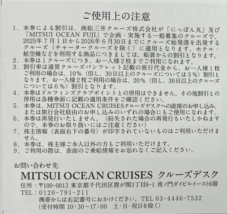 商船三井 株主優待券【にっぽん丸クルーズ優待券 26.6.30まで】