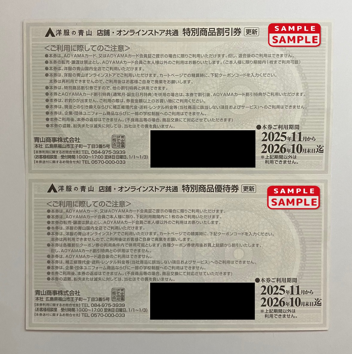 ■洋服の青山各店舗及びオンラインストア共通の割引券および優待券(各1枚で1セット)です。利用方法など詳細は画像にてご確認願います。